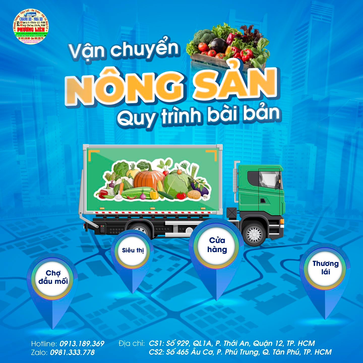 Với kinh nghiệm nhiều năm trong lĩnh vực logistics và vận chuyển hàng hóa, đặc biệt là nông sản, Nhà Xe Phương liên - Chành Xe Phương Liên cam kết mang đến giải pháp tối ưu, giải quyết mọi lo lắng của quý khách hàng khi gửi hàng nông sản đến các chợ đầu mối.